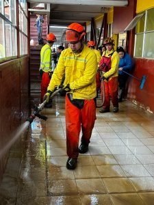«Ahora estamos apoyando en la limpieza de las instalaciones del establecimiento educacional para que los alumnos puedan tener sus aulas disponibles lo más pronto posible. Contamos con brigadas de protección de incendios y coordinamos maquinaria y camiones para agilizar la extracción de tierra y barro», relató Castro.